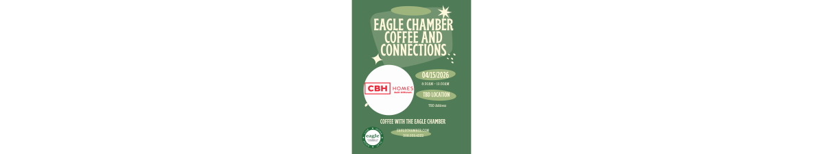 Eagle Chamber Coffee & Connections - CBH Sales & Marketing Date and Time Wednesday Apr 15, 2026 8:30 AM - 10:30 AM MDT April 15th 8:30am-10am Fees/Admission no fee Set a Reminder Enter your email address below to receive a reminder message. Email address Select the amount of Days before the event -- Select Days Before Event -- 1 Day 2 Days 3 Days 1 Week Captcha Validation Please complete the Captcha Submit Description Eagle Chamber Coffee & Connections @ TBD Set a Reminder Enter your email address below to receive a reminder message. Email address Select the amount of Days before the event -- Select Days Before Event -- 1 Day 2 Days 3 Days 1 Week Captcha Validation Please complete the Captcha Submit Share × Print Email Add to Calendar Facebook Twitter LinkedIn Tell a Friend × Select Calendar Type × Google Yahoo iCal (Outlook, Apple, or other)